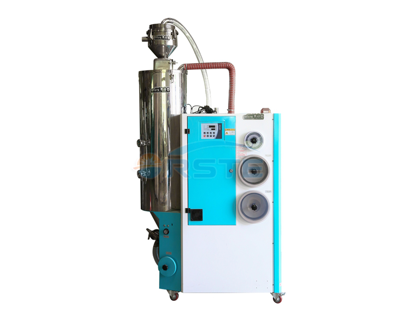 Suction: material is absorbed into barrel from storage barrel or other storage containers. When the magnetic reed switch detects no material, suction motor runs to produce vacuum inside vacuum hopper. Raw material in storage barrels is absorbed into suction hopper due to air pressure difference. When material suction completes, motor stops. Raw materials drop into drying hopper barrel due to gravity. The dried raw material after dried is taken out to the hopper with photo-sensor installed on molding machine or other hopper from drying hopper barrel.